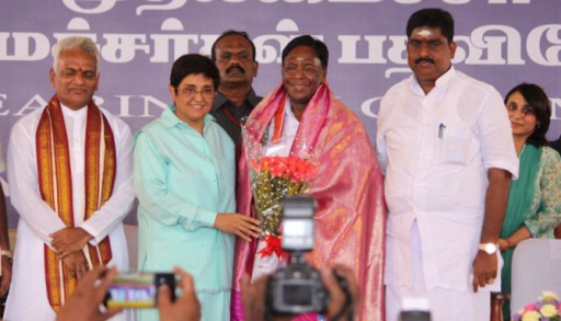 •    Lieutenant Governor Kiran Bedi administered his oath of office and secrecy along with five ministers at Gandhi Thidal in Beach Road.