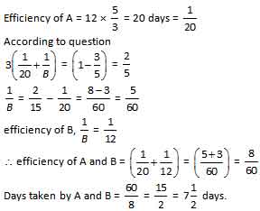 A does \(\cfrac{3}{5}\) part of work in 12 days. After that he completed the remaing work in 3 day with the help of B. In how many days will A and B together do the same work.