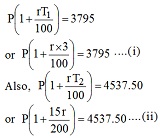 Dear Student, Its SI... Amount = Simple Interest + Principal ______________(1) Means A=SI+P We know, Simple Interest, SI = (P*R*T)/100 Put SI the value of SI in equation(1): A=(P*R*T)/100 + P A = P(1+ RT/100) An amount becomes ₹3795 in 3 years So, it can be represented as: 3795 = P(1+ 3R/100) P=379500 / 3R+100 _____________(2) Same amount becomes ₹4537.50 in 7.5 years So, it can be represented as: 4537.50 = P(1+ 7.5R/100) P=453750 / 7.5R+100 _____________(3) From (2) and (3), 379500 / 3R+100 = 453750 / 7.5R+100 Now, you must know how to calculate the value of R from the above equation. R = 5% Keep Learning with Us Best Wishes Team Toprankers