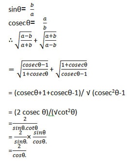 Dear Student, sin@=b/a 1/cosec@ = b/a a=b. cosec@ a-b = bcosec@-b = b(cosec@-1) a+b=bcosec@+b = b(cosec@+1) a+b / a-b = b(cosec@+1) / b(cosec@-1) = (cosec@+1) / (cosec@-1) Keep Learning with Us Best Wishes Team Toprankers