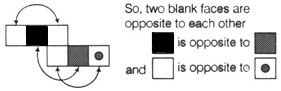 Alternative faces are opposite to each other when 3 faces are in line , so in upper layer blank will be opposite to blank while in lower layer , the blank face will be opposite to dotted face. Now form the combination , you will get the answer.