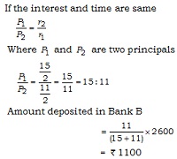 Chaman had a total of 2600, a part of it he deposited in Bank A and the remaining amount in the bank B. Banks A and B pay simple interest at the rate of 5\(\cfrac{1}{2}\)% and \(7\cfrac{1}{2}\)% respectively. After a certain time he receives same interests from both banks, then the amount invested in Bank B was: