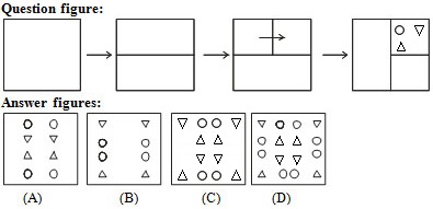DIRECTIONS: In the following questions a piece of paper is folded in the manner shown in the question figure(s). Select the figure out of the answer choices showing the unfolded pattern after the punches (cut).